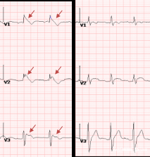 术前V1-V3导联可见Brugada波(左图),术后V1-V3导联Brugada波消失(右图)